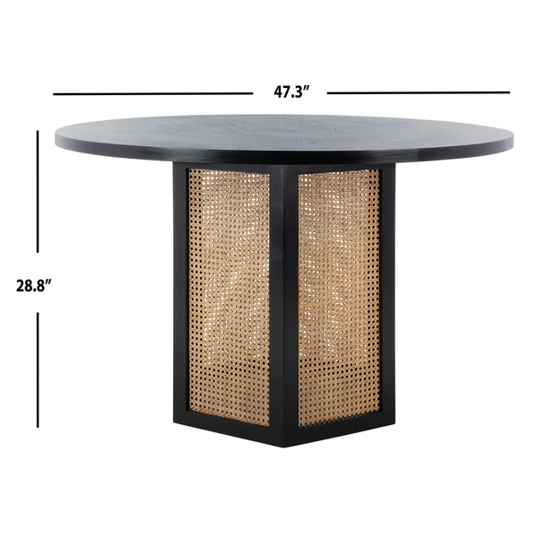 Coastal cool style meets contemporary chic in this Adela Dining Table. A natural cane hexagonal base is beautifully paired with a sleek black wood top and panel trim, perfectly showcasing Adela’s mixed media artistry.