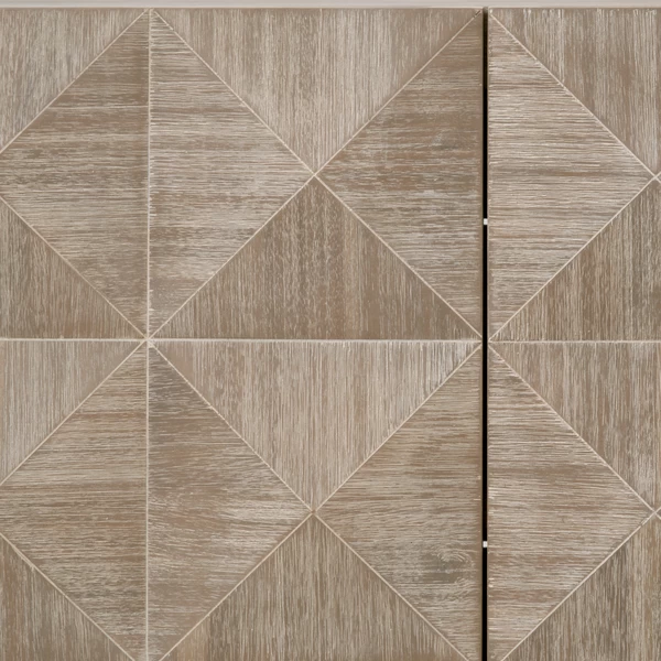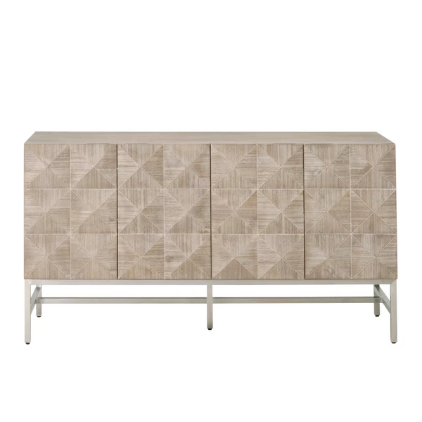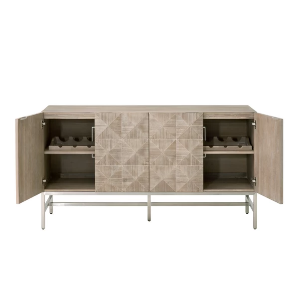 This sideboard features raised diamond pattern door panels in a natural grey finish with a brushed stainless steel base. Effortlessly store items or media components inside with its removable wine racks and cord management holes.