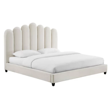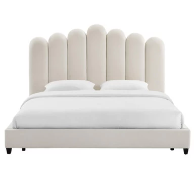 Our plush velvet Bree bed makes for the perfect backdrop for relaxing in style. Boasting an arched, channel-tufted headboard with a scalloped silhouette and black stained legs below for added support.