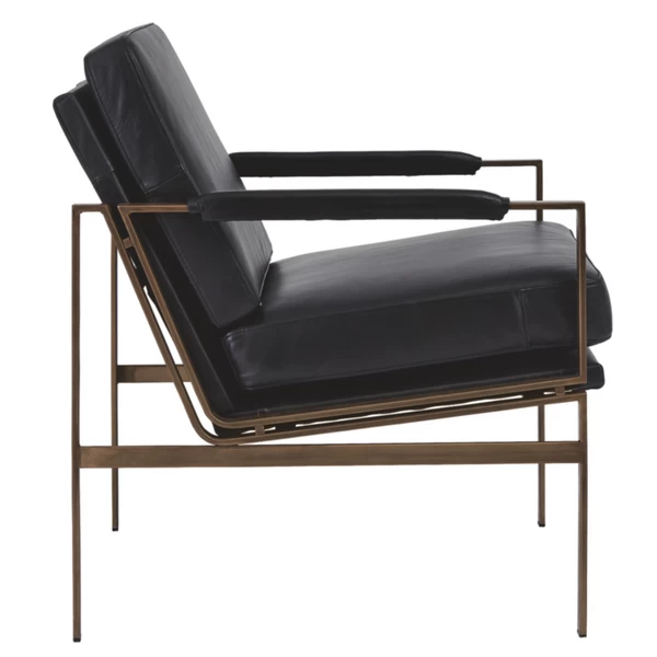 A fresh take on classic midcentury forms, this chair features a sleek metal frame in oil-rubbed bronze with black leather upholstery and matching manchettes.