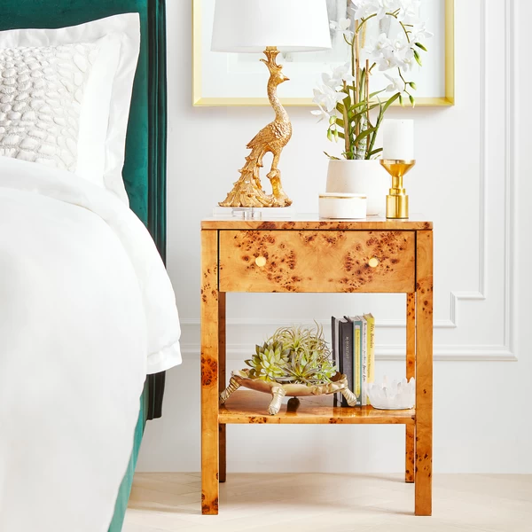 Our Brynn nightstand makes a stunning focal point in the bedroom with its richly figured burl veneers and modern, clean-lined silhouette. A high-gloss finish and brass hardware complete this luxe design.