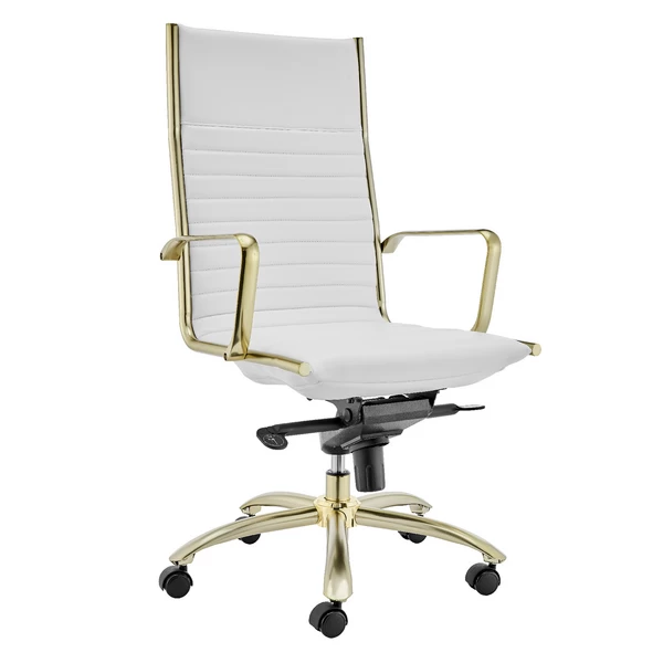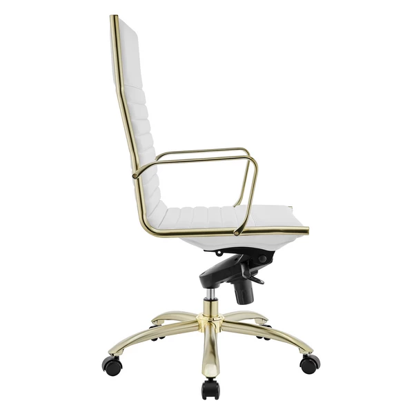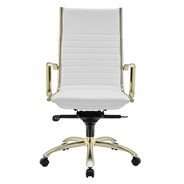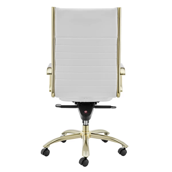 Designed with a high back, brushed gold tone frame, and channeled faux-leather upholstery, this desk chair brings both style and function to the home office. Constructed in one piece, its seat and back interior is wrapped in flat bungie banding for all-day comfort, while casters make the chair easy to move without damaging your floors.