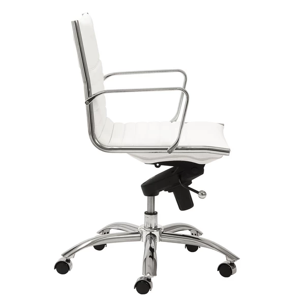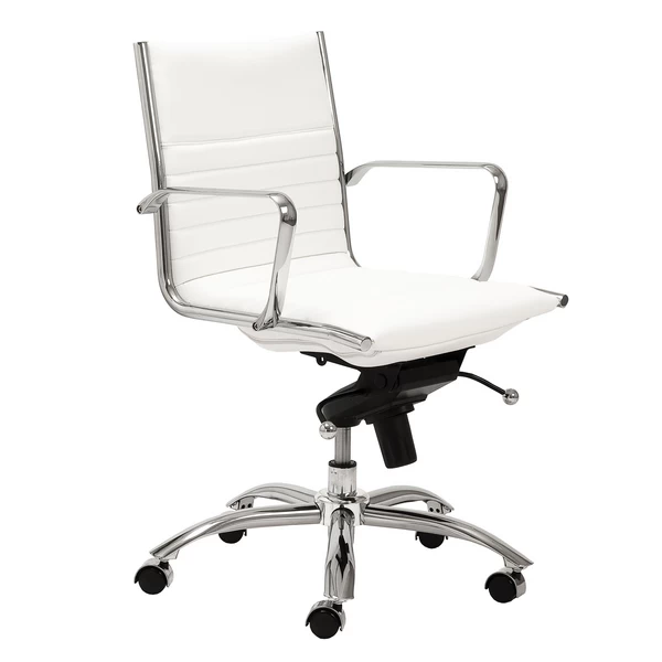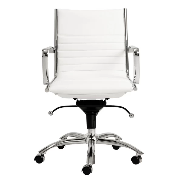 Designed with a chromed steel frame and channeled faux-leather upholstery, this desk chair brings both style and function to the home office. Constructed in one piece, its seat and back interior is wrapped in flat bungie banding for all-day comfort, while casters make the chair easy to move without damaging your floors.
