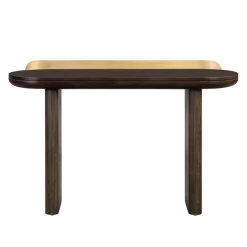 A sleek addition to the entryway or living room, this console immediately draws the eye with its oblong silhouette, brass backsplash, and dark espresso finish.
