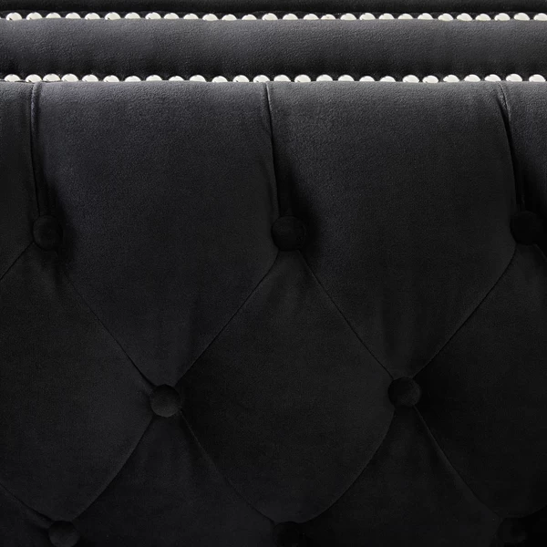 Combining notched arms, deep button tufting, and gleaming nailhead trim, the handcrafted pieces in our Hampstead Collection deliver timeless elegance and a dash of glamour to any room, while kiln-dried hardwood frames and ample padding ensure long-lasting comfort and support. Shown in Bella Velvet Black with bright nickel nailheads.