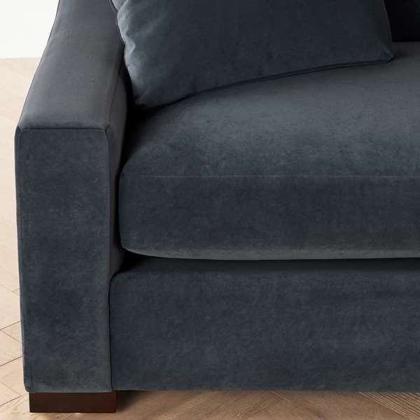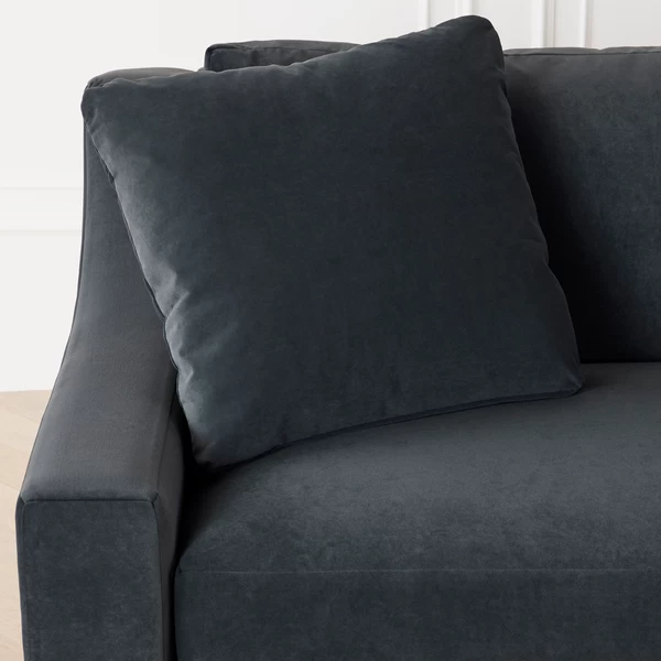 The Hayes sofa is stylish and comfortable, featuring a wide, sloped track arm. The deep seated comfort of the sofa is perfect for relaxing and lounging, making it an ideal addition to any living room or family room. Shown in Lucca Velvet Charcoal.