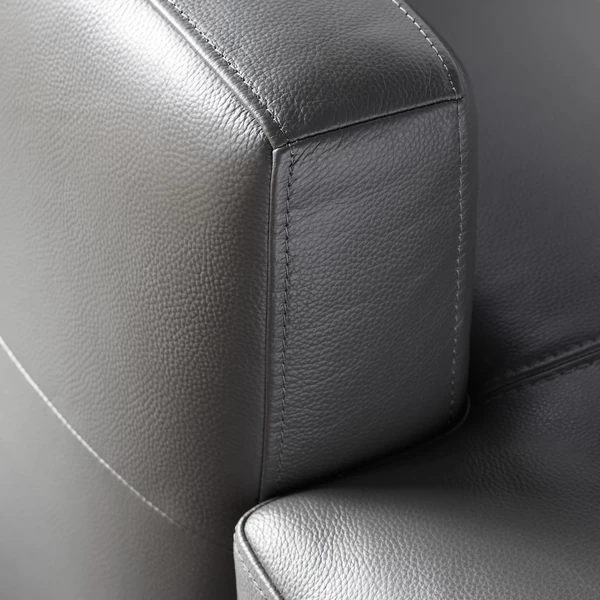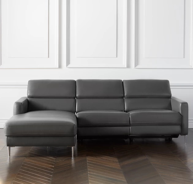 Upholstered in top-grain, semi-aniline leather and perched on polished stainless-steel legs, this two-piece sectional makes a sleek and modern statement in the sitting room, while its powered reclining end seat, adjustable headrests, and ample padding ensure a comfy seat.
