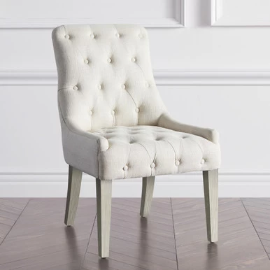 Our Jen Chair features a subtle curve and deep, button tufts that are applied by hand in a diamond pattern. Shown in Maxwell Linen Alpaca.