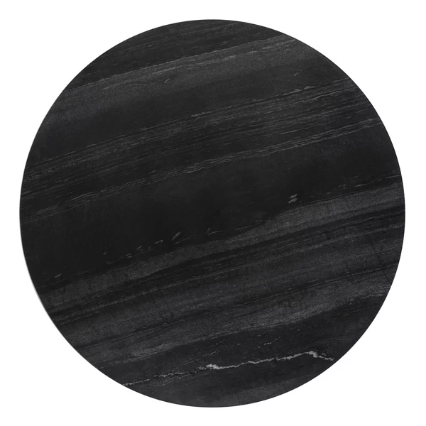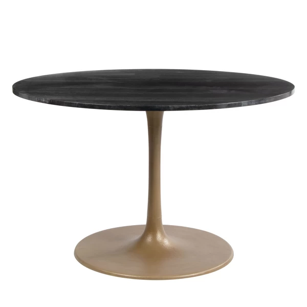A modern dining table designed with a black marble top featuring unique white veining and a tulip shaped base in a rich gold finish.
