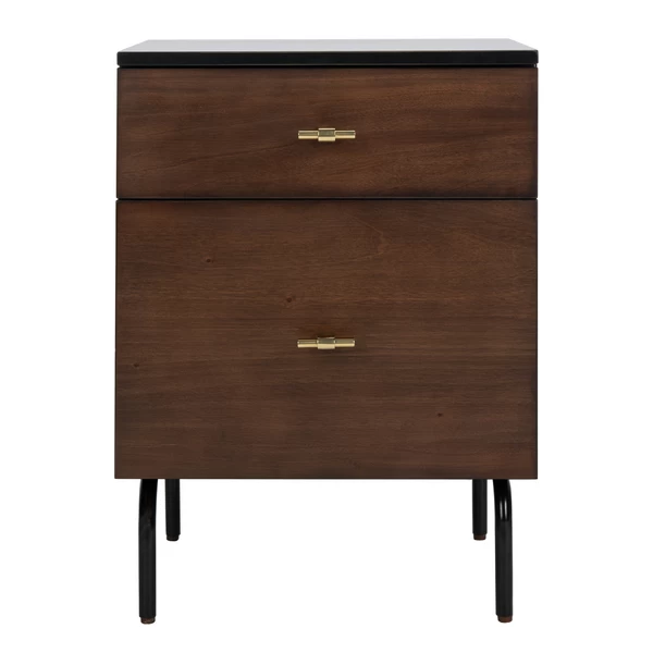 Elegant and modern, the natural beauty of the Kip nightstand adds style and warmth to any bedroom. Finely crafted of mahogany wood, Genevieve’s rich walnut finish and black metal legs give it vintage style charm. Two spacious drawers make for easy storage.