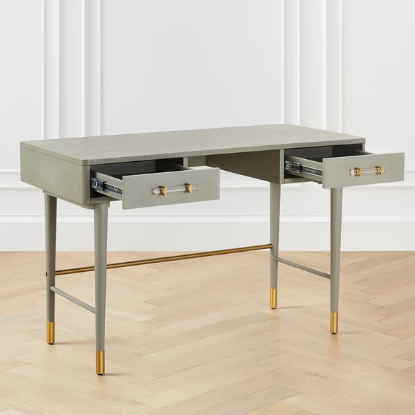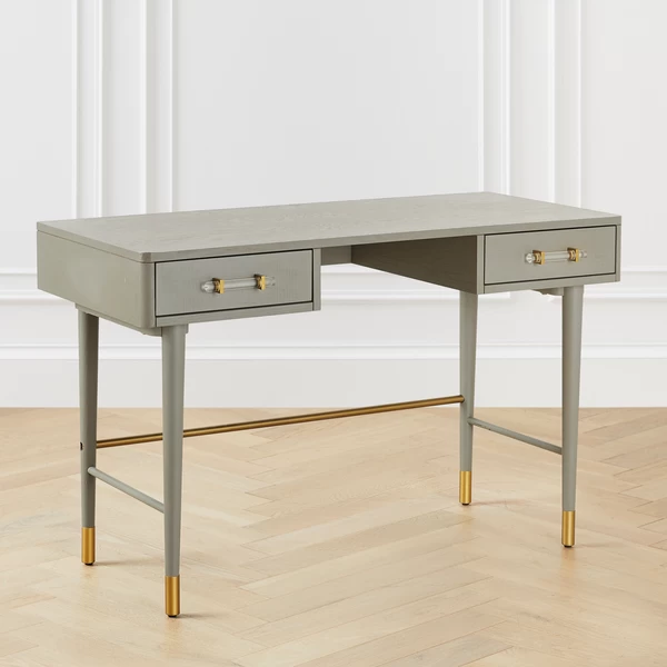 This midcentury-style desk smoothly transforms retro-chic style into sophisticated contemporary decor. Its open geometric frame of sleek grey-finished wood gives any room a rich, airy ambiance, while the brass-finished stainless steel caps and accents complete the look for a touch of glamour.