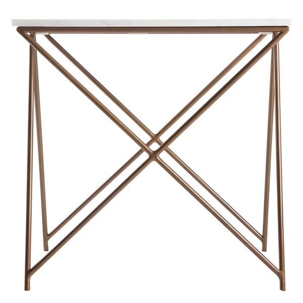 Our Lyon collections geometric legs provides visual interested to any room. A marble top is paired with a painted brass finish.