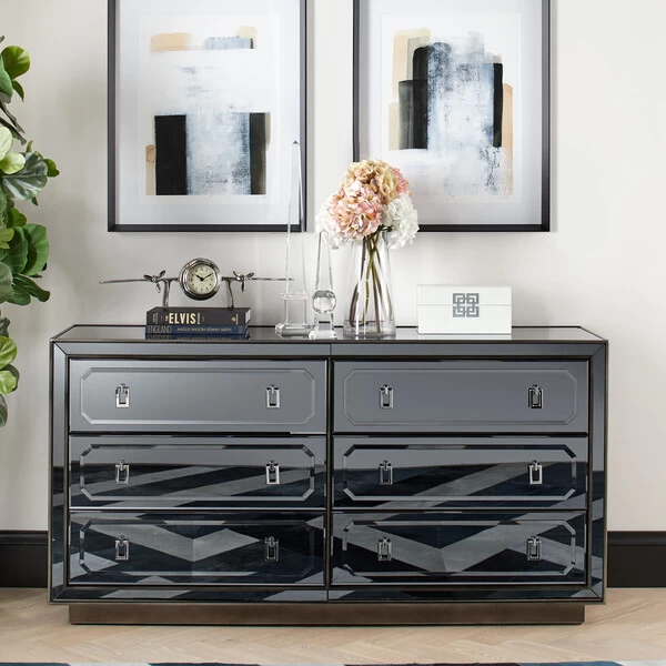Designed with clean lines, beveled mirror paneling, and a graphite finish, our Maddox Collection delivers sleek style to the bedroom with a modern, masculine edge. Polished nickel ring pulls and black drawer interiors complete the luxe look.