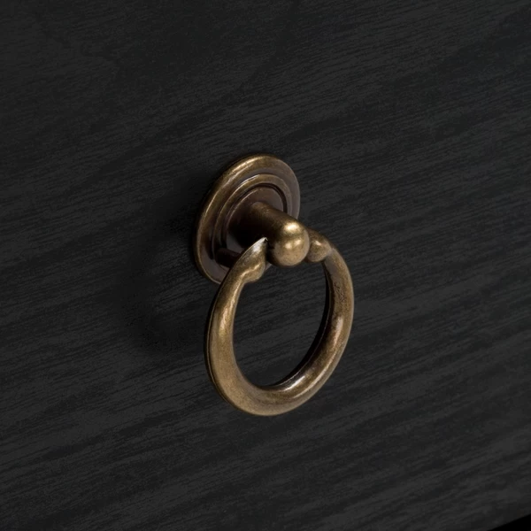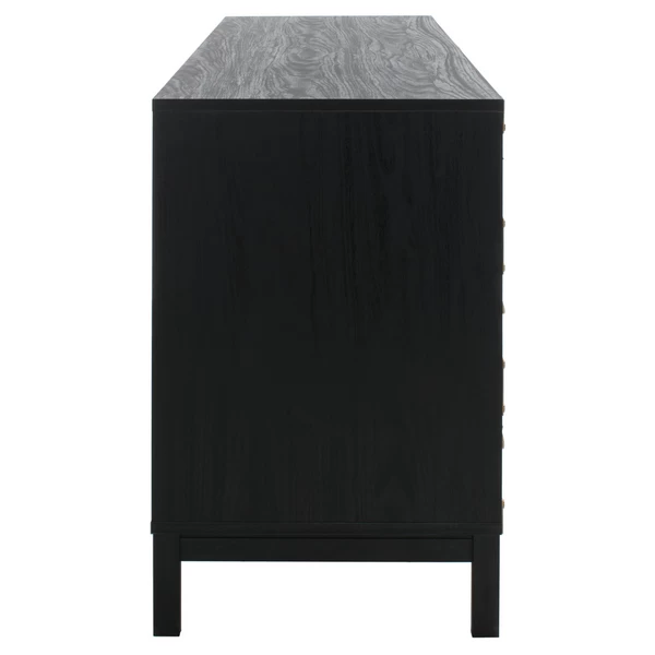 Keep your home organized and clutter-free with our charming and spacious Mylo dresser. Thoughtfully streamlined, the crisp and clean lines of our chest boast timeless aesthetics. It is gracefully perched and adorns a rich black veneer to enliven your home. Being inspired by the effortless beauty of vintage style, our chest is finished off with ring pulls and gold hardware on the edges. An elegant and timeless addition, the chest includes 6 drawers to store and organize all your clothing, linens, and accessories.