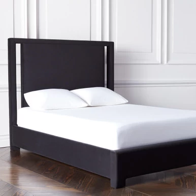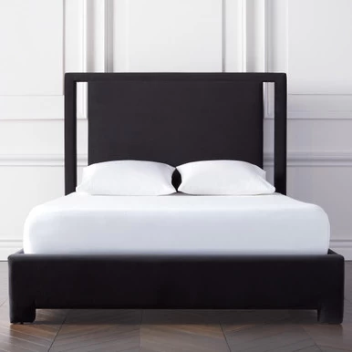 Framed in sturdy kiln-dried hardwood, our Roya platform bed boasts an elegant, clean-lined silhouette, neatly tailored upholstery, and side cutouts on the headboard for added impact and drama. Shown in Bella Velvet Black.