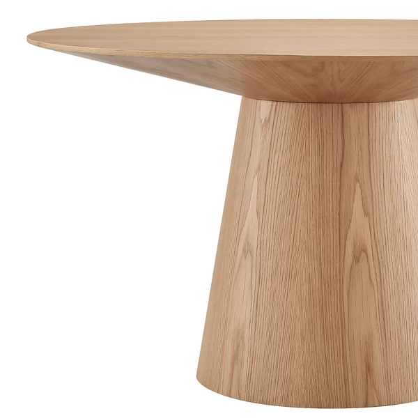 Designed with a oak veneer finish and sculptural silhouette, this dining table lends cool, contemporary style to the dining room. Assembly required.